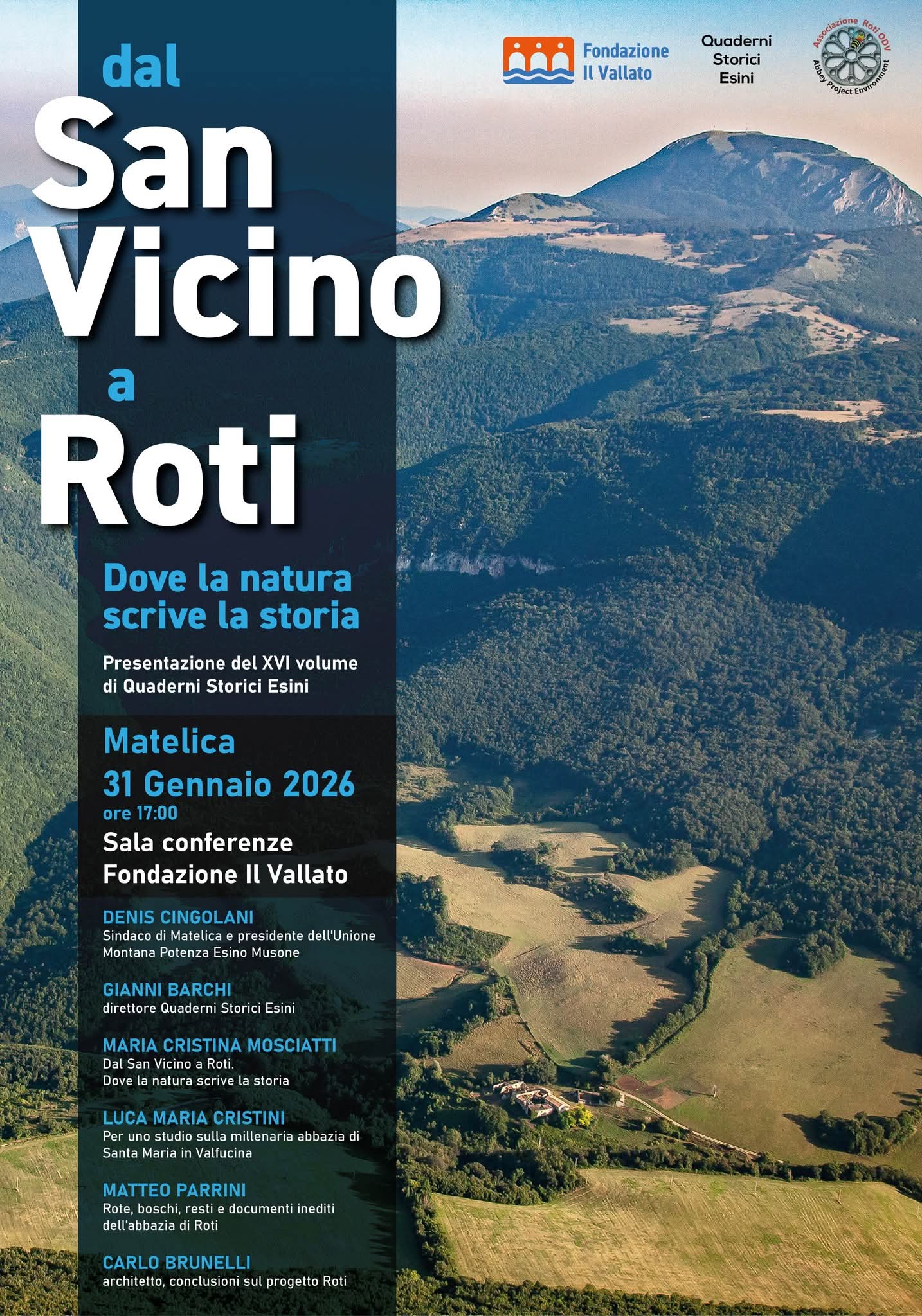 DAL SAN VICINO A ROTI. DOVE LA NATURA SCRIVE LA STORIAUn evento dedicato al San Vicino, alle sue abbazie e al futuro di un importante patrimonio naturalistico e culturaleSABATO 31 GENNAIO ORE 17.00 + Aggiungi a Google Calendar+ iCal / Outlook export 00giorni 00ore 00minuti 00secondi Data31 Gen 2026 Ora 17:00 LuogoSala Conferenze FONDAZIONE IL VALLATO Condividi questo evento